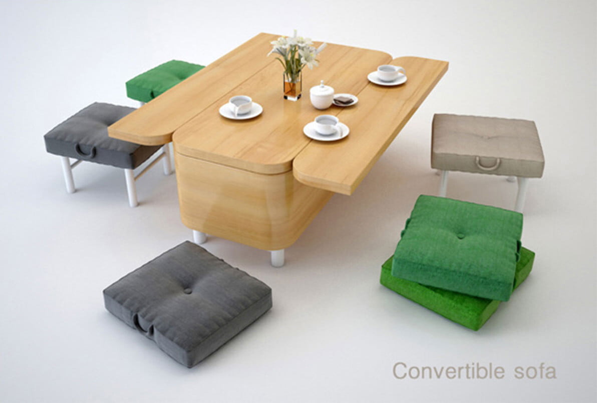 La #designer ucraina Julia Kononenko ha realizzato Сonvertible Sofa, un divano che può facilmente trasformarsi in un tavolo per sei persone comprensivo di sgabelli con cuscino. Ideale per piccoli appartamenti.