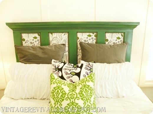 Questa testata per letto è invece realizzata con una vecchia porta, decorata con ritagli di stoffa.