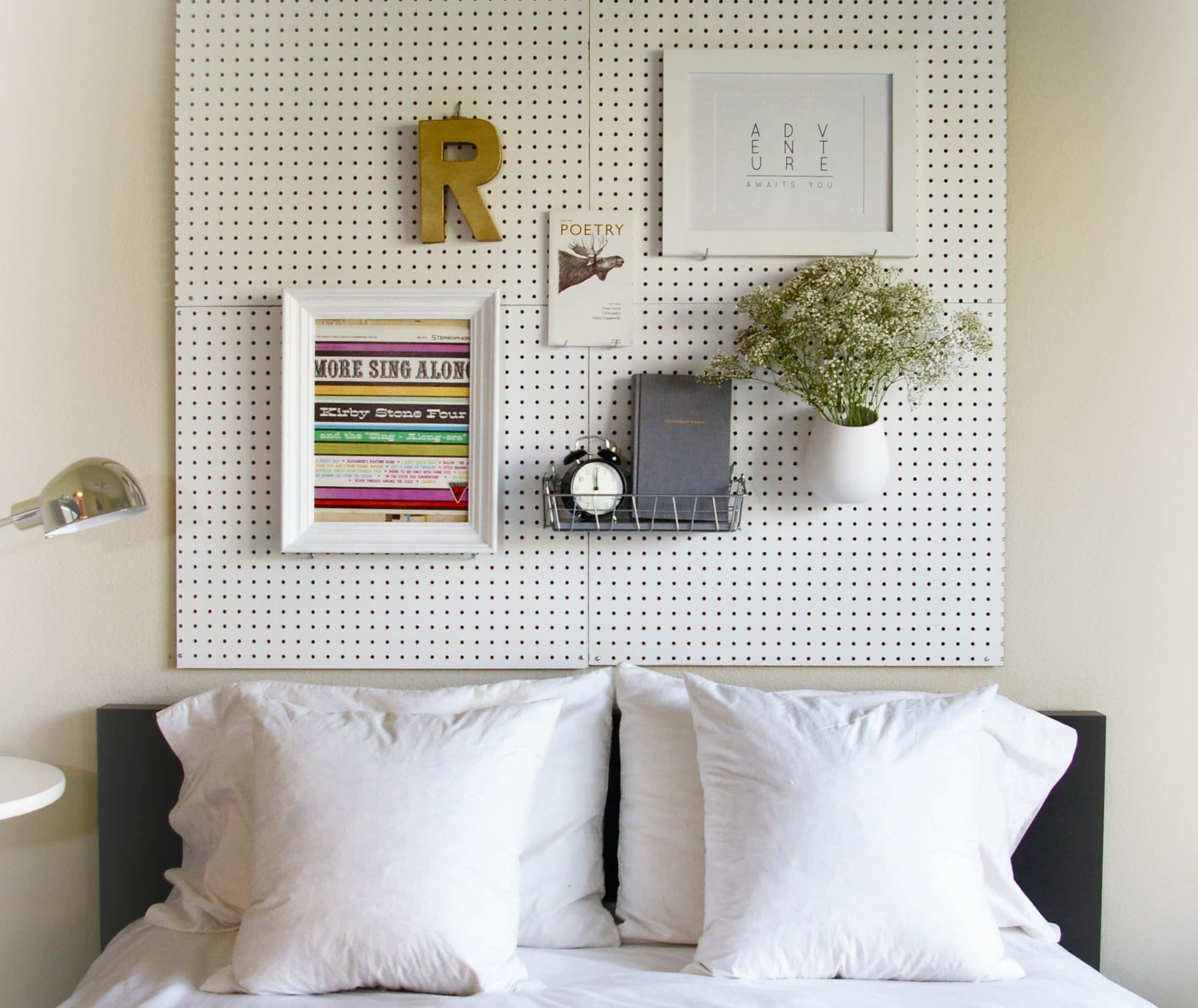 Originale e versatile, questa testiera è realizzata con i pannelli forati che si di solito si utilizzano per riporre attrezzi e strumenti da lavoro.