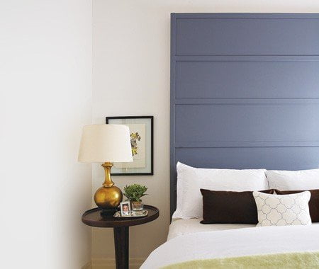 Anche qui c’è un bel pannello di legno, ma questa volta è ben in vista. Il risultato: una testiera moderna e minimalista.