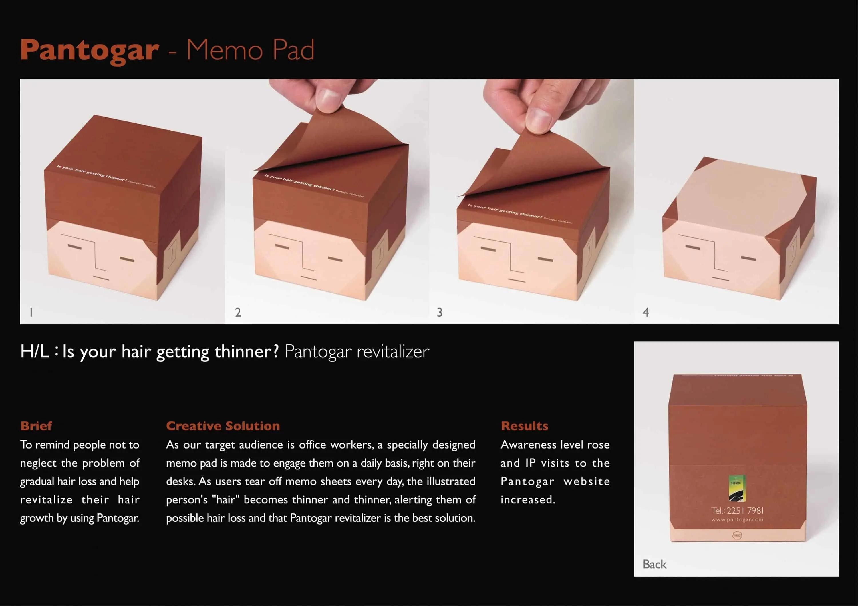 Per promuovere i prodotti Pantogar contro la caduta dei capelli, l’agenzia pubblicitaria JWT di Hong Kong ha realizzato Pantogar Memo Pad: “Tutti perdiamo capelli giorno dopo giorno. Tienilo a mente.”.