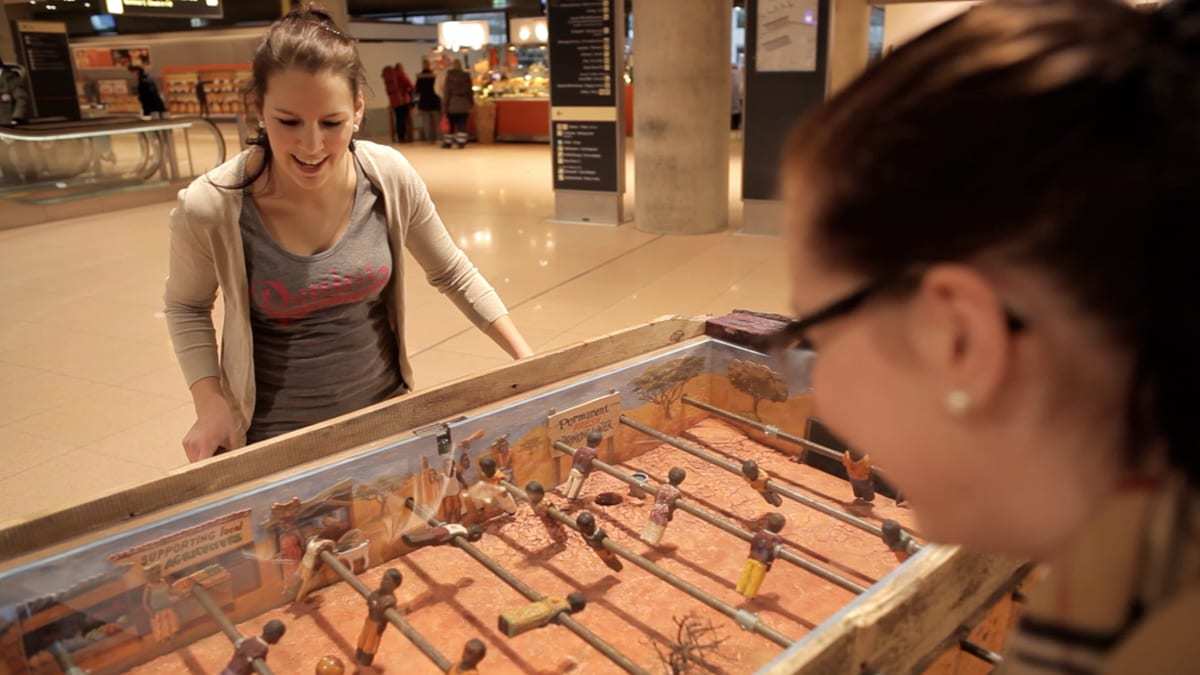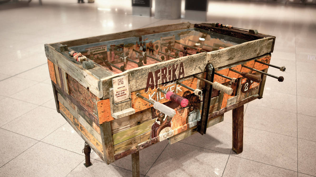 Afrika Kicker è il calcio balilla africano che permette di raccogliere donazioni per l’iniziativa “2 Euros Help”. Il biliardino ha un fondo di sabbia irregolare e un albero in mezzo al campo, ai bordi del campo ci sono immagini di progetti sostenuti dalle donazioni. Il gioco è disponibile anche per i dispositivi mobili e su Facebook, in un design sorprendente africano. Per maggiori informazioni visita il sito afrika-kicker.de e partecipate numerosi!