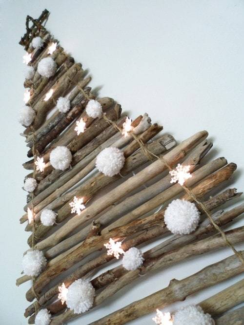Con un seghetto tagliate i rami, ottenendo tanti elementi di lunghezza diversa e progressiva. Disponete i rami a terra, l’uno dopo l’altro, e “disegnate” la sagoma dell’albero. Unite gli elementi con la corda, avvolgendo il filo alle estremità dei rami. In corrispondenza della punta, lasciate un segmento di corda per appendere l’albero.