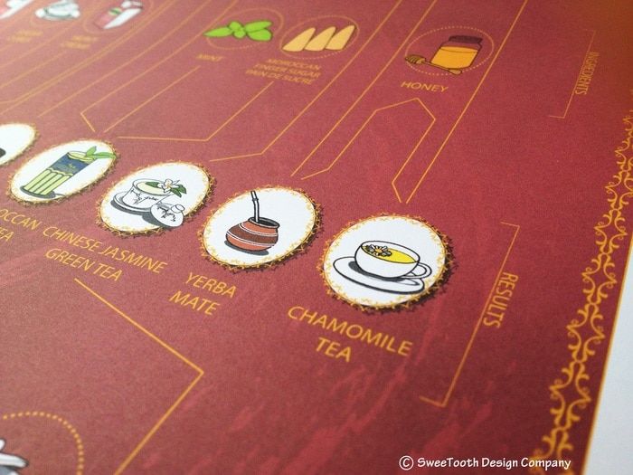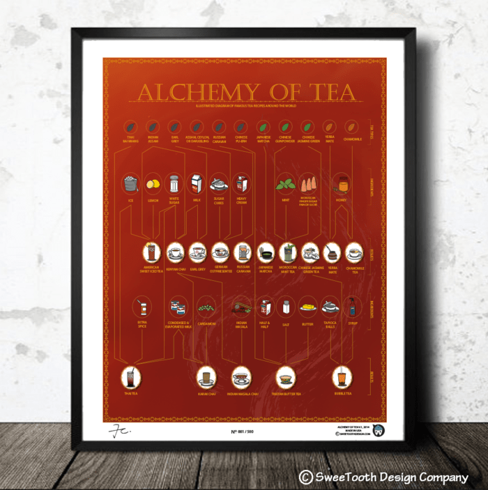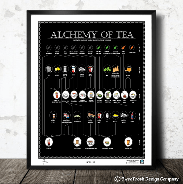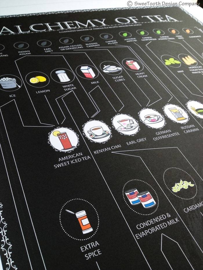 Alchemy of Tea è la prima illustrazione infografica, realizzata da SweeTooth Design, che raffigura le ricette tradizionali dei tè di tutto il mondo. Non è solo un poster, ma un diagramma informativo di una delle bevande più amate, il tè. Il poster mostra 15 ricette che nascono dalla miscelazione del tè con ingredienti diversi. L’aspetto più interessante è che, con l’aggiunta di uno o più ingredienti, l’intera ricetta può assumere sfumature di sapore differenti. Inoltre lo scopo di questa illustrazione è quello di mostrare le relazioni esistenti tra le diverse ricette di tè.