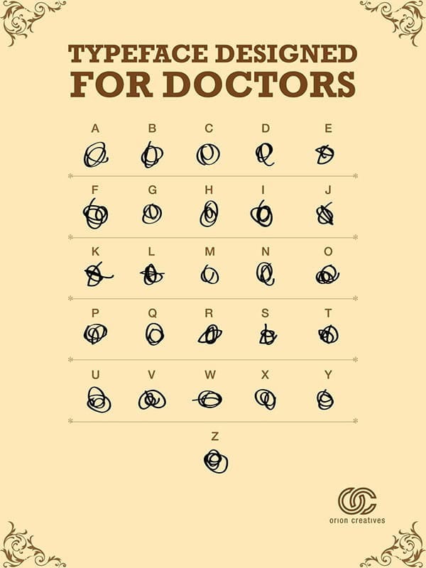 Orion Creatives ha realizzato un ironico alfabeto medico che associa ad ogni lettera un simbolo grafico. L’illustrazione è senza dubbio divertente, e chissà che non sia anche utile a comprendere la grafia notoriamente illeggibile dei dottori!