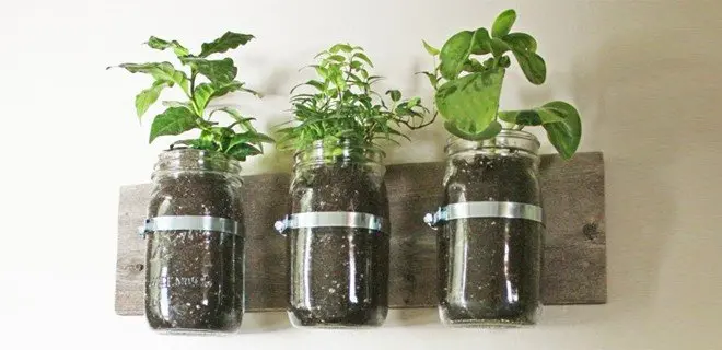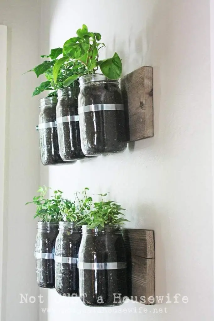 Due tavole di legno grezzo, ripulite e scartavetrate, fungono da base. Sei barattoli di vetro, da riciclare tra i contenitori per alimenti, sono usati come vasi, e fissati al legno con fascette in acciaio.