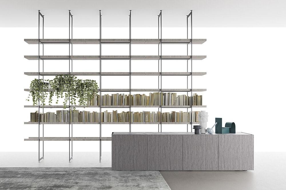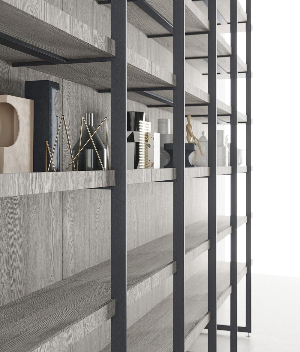 La libreria è una variazione armonica e aerea di piani orizzontali e linee verticali, è composta da una struttura in metallo con incastonate mensole in legno dalla curvatura tipo vassoio. L’effetto estetico si manifesta in un gioco di spessori e fluida matericità.