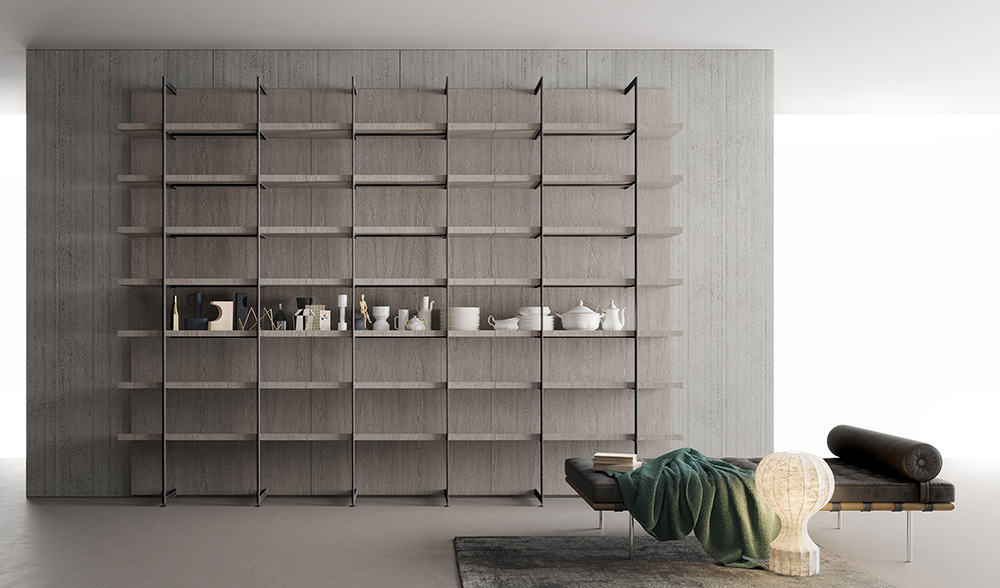 Proposta nella versione a parete o auto-portante con fissaggio a soffitto e a terra, la libreria pone grande attenzione alla selezione dei materiali interpretati dall’innovativa finitura bronzo satinato per la parte metallica e dal legno con finitura Claywood per i ripiani. Claywood è una resina liquida con trattamento “invecchiato” effetto gommato che rende la superficie particolarmente piacevole e sorprendente al tatto oltre a risultare molto resistente ai graffi.