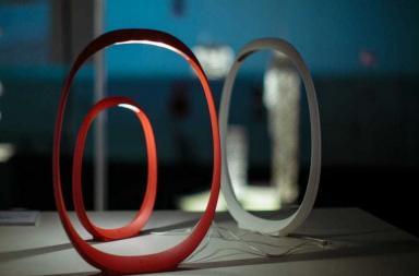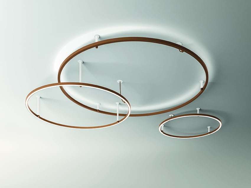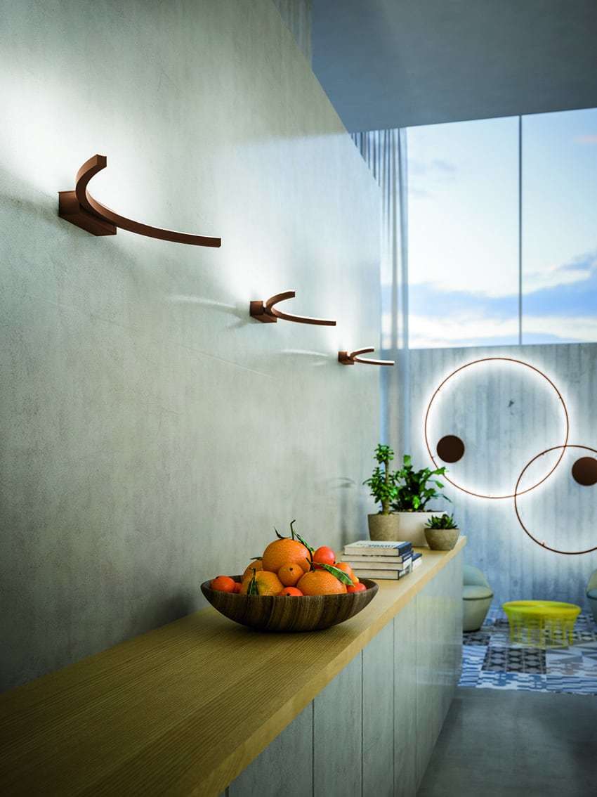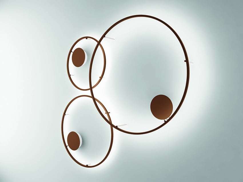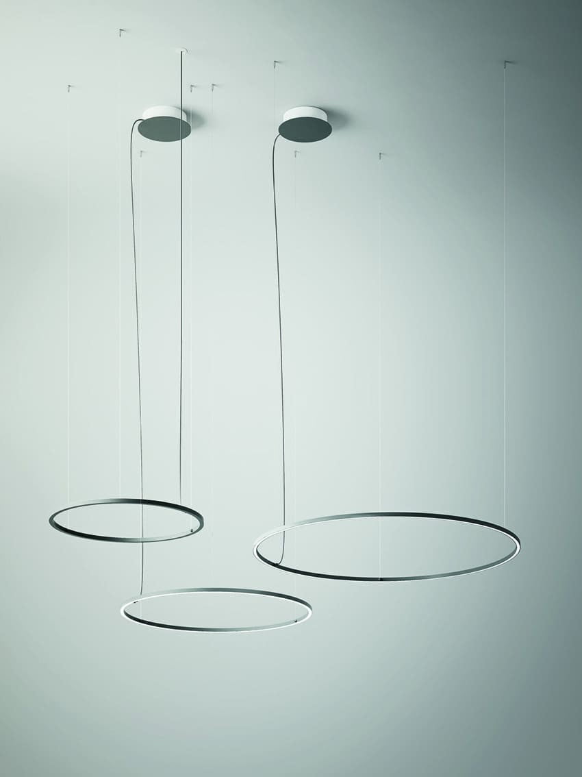 Una prima versione, che è stata presentata nel 2016 e comprende tre sospensioni, vede l’abbinamento di due linee curve: una linea a forma di U rovesciata e un anello sottostante, nel quale si colloca la fonte luminosa. La nuova versione 2017, ancora più grafica, si compone di un solo elemento circolare declinato a sospensione, a parete (disponibile anche a semicerchio) e a soffitto. In entrambi i modelli la fonte luminosa LED integrata nella struttura diffonde una morbida luce bianca dimmerabile.