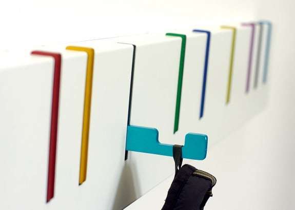 Per appendere gli abiti è necessario estrarre i ganci, che sono nascosti all’interno nella barra. L’appendiabiti è disponibile nell’elegante versione monocromatica e nella vivace finitura multicolore.
