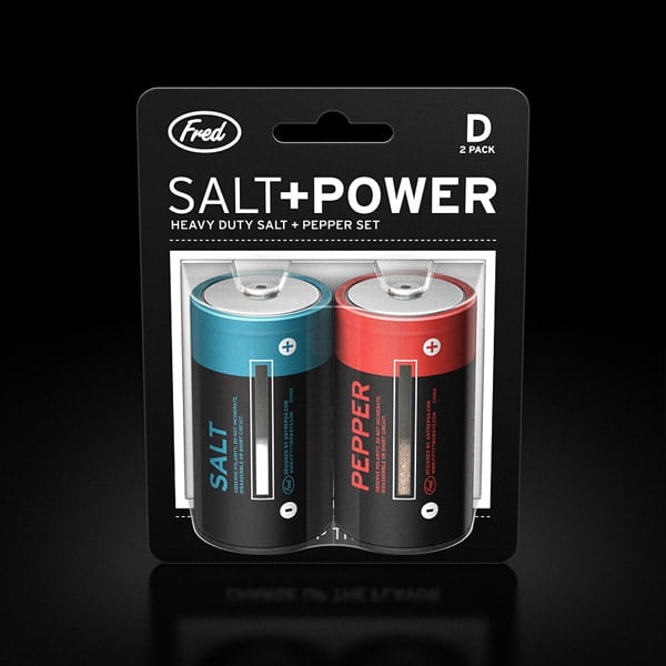La confezione richiama il Package delle classiche pile, ma il suo contenuto porta a tavola un tocco di creatività per servire il sale e pepe. I colori differenziano le 2 spezie, il rosso per il pepe ed il blu per il sale. Un accessorio per la vostra tavola che porterà un look diverso e innovativo.