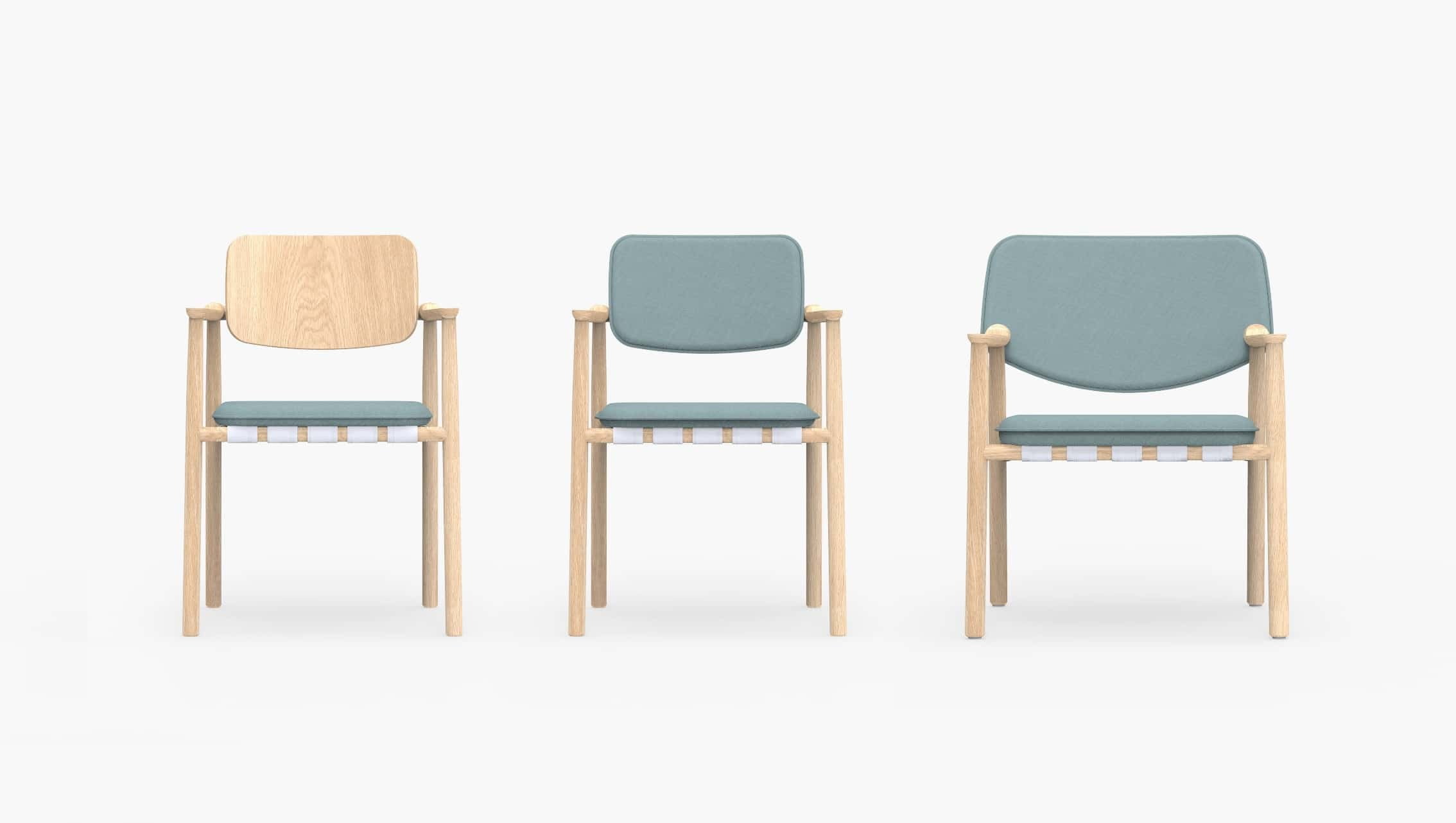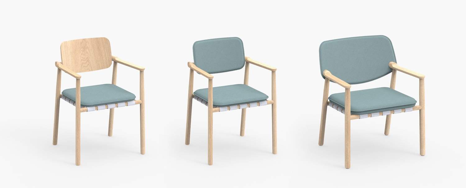 La collezione presenta due tipi di sedia, la classica da tavolo e la lounge, con misure più ampie e confortevoli.