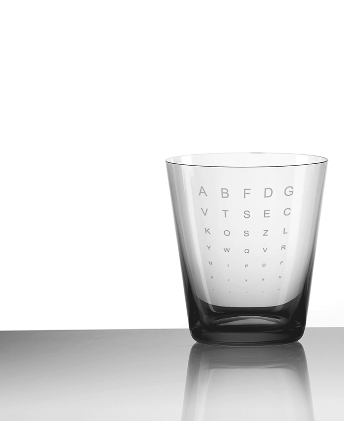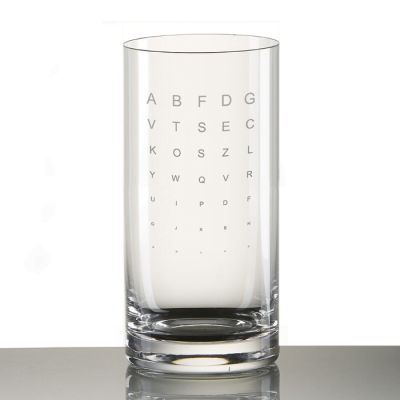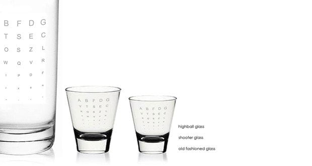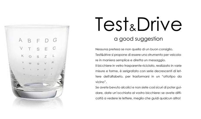 Il bicchiere Test&Drive è realizzato in vetro di varie misure e forme ed è serigrafato con una riproduzione di un ottotipo, la riduzione del campo visivo è direttamente proporzionale alla quantità di alcool consumato, e se avete difficoltà a vedere le lettere, meglio che guidi qualcun altro!