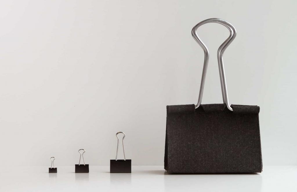 Il designer di Seattle Peter Bristol ha realizzato Clip Bag, una borsa in feltro, elegante, dallo stile classico, che si apre e chiude grazie a una clip in alluminio. La borsa Clip Bag prende in prestito giocosamente la sua forma da una comune clip legante.