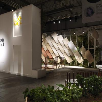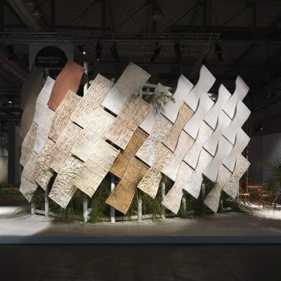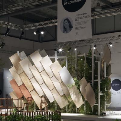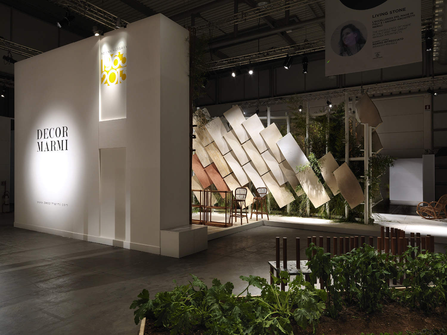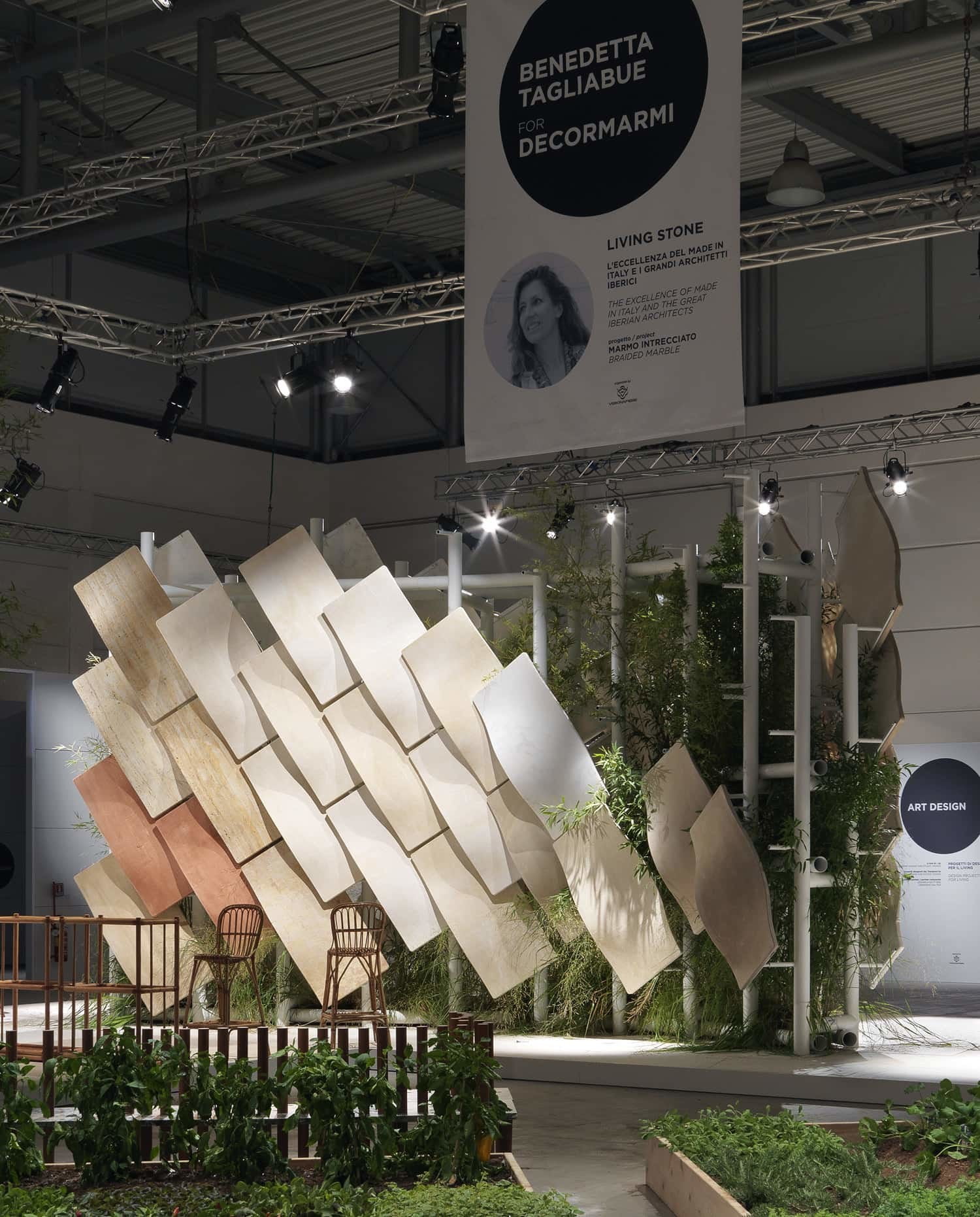 “Nell’ideare una proposta che celebri la tradizione di Decormarmi – afferma Benedetta Tagliabue – si è deciso di trattare la pietra come fibre vegetali flessibili, che seguano una superficie ondulata come nel nostro famoso padiglione per l’Expo di Shanghai; conferendo allo stand la leggerezza del vimini.”