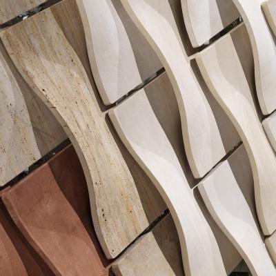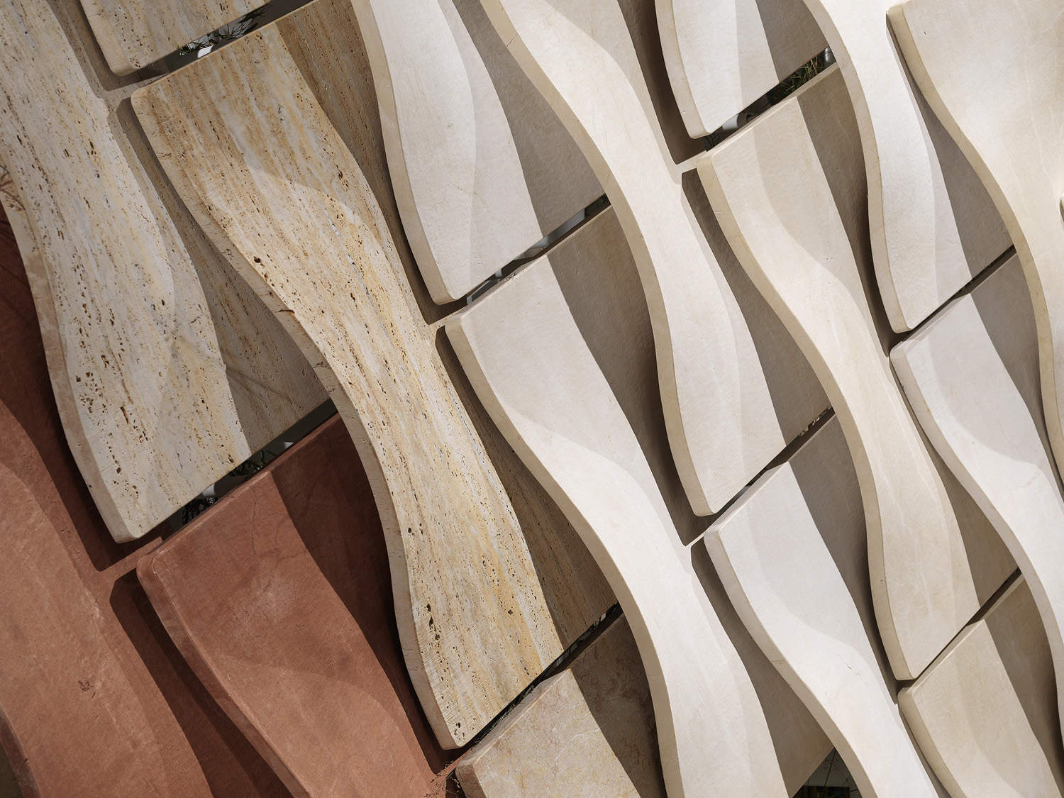Il concept si basa su un sistema di pannelli ondulati che riprendono la texture del vimini intrecciato. Sessantanove “vele in marmo ondulate di vimini” sono appese ad un’anima portante in metallo alta 5 metri e lunga sette disposta a “ventaglio”. Ne risulta un volume sospeso e leggero composto da marmi dai diversi colori che riprendono i cromatismi del vimini. In contrapposizione alla levità del marmo intrecciato, il pavimento utilizza lastre con superficie lavorata volutamente grezza per richiamare il concetto di materiale lapideo allo stato naturale.