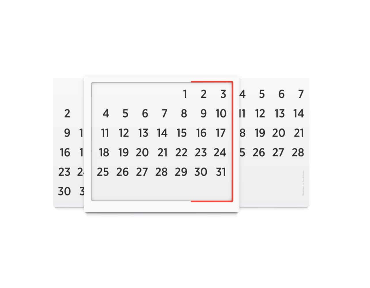 Ilya Birman ha realizzato Forebruary, un semplice calendario universale da parete perpetuo. La cornice mobile sopra la superficie inquadra ogni mese e la striscia rossa evidenzia il weekend. Il calendario universale da parete Forebruary è un oggetto che non ha paura del tempo che passa, data la sua peculiarità, il calendario si adatta allo scorrere del tempo il suo frame scorrevole segna sempre la data esatta evidenziando i giorni festivi.