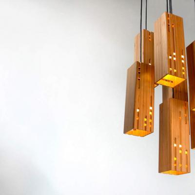 La luce a sospensione realizzata in legno di bamboo è disponibile nei colori caramello e castagno, e può essere installata sia singolarmente che a gruppi.