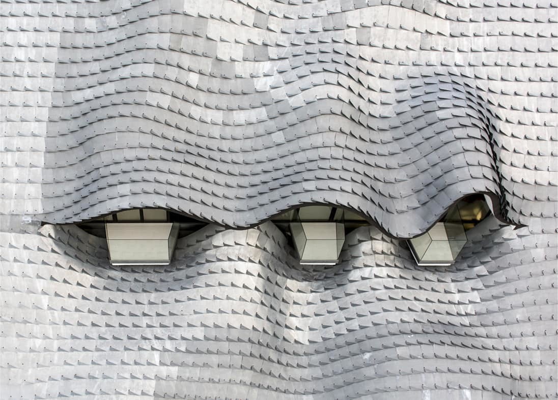 L’estetica è dissonante, contesa tra naturale e artificiale: a colpo d’occhio, il tetto metallico sembra disegnato sul declivio roccioso, ma dietro la trama ondulata si nasconde uno spazio abitativo confortevole e moderno.
