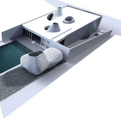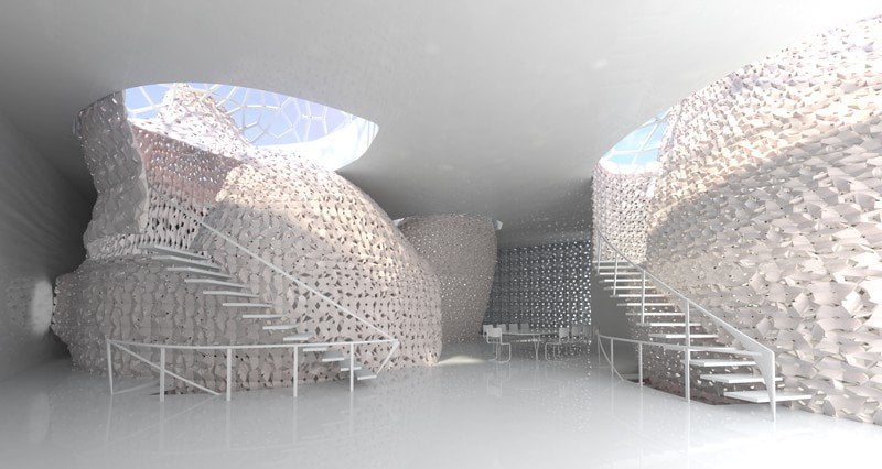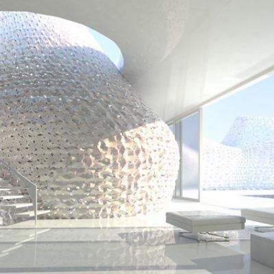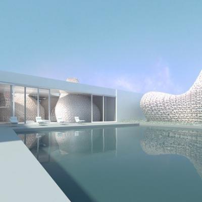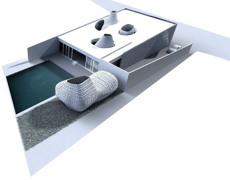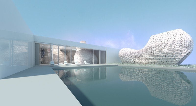 L’esterno dell’edificio assicura continuità con l’ambiente interno, con una mirabile struttura stampata in 3D, adiacente alla piscina.