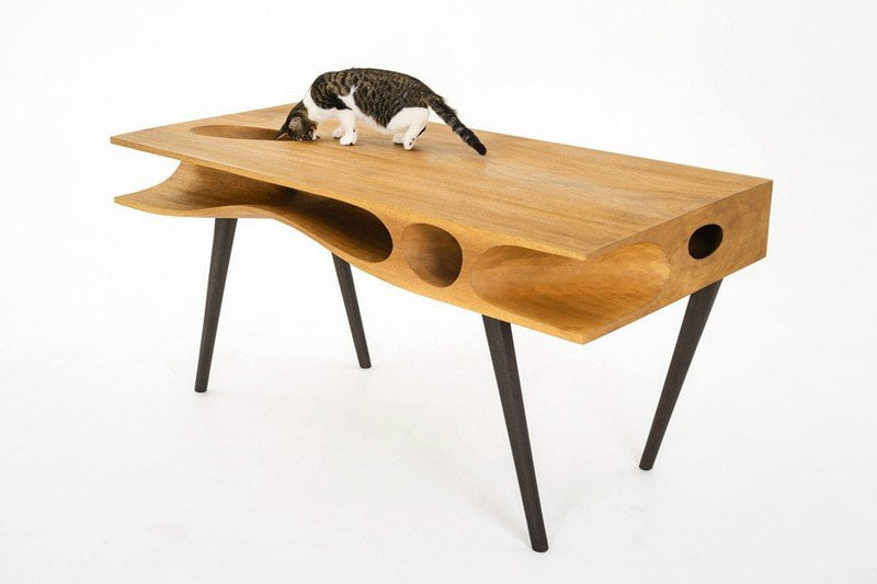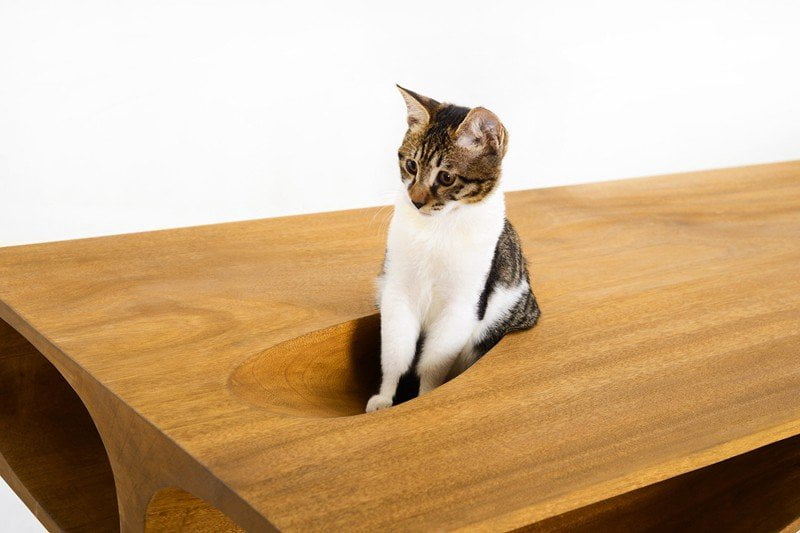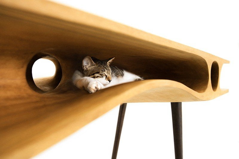 Il primo prodotto della linea CATable è un tavolo elegante e sinuoso, che soddisfa le esigenze di tutti: il padrone può lavorare indisturbato, senza escludere il suo amato gattino, che può divertirsi ad esplorare il labirinto ricavato sotto la base del tavolo.