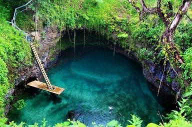 Grazie a una lunga scala si accede a Tosua Ocean Trench, una piscina naturale che si trova sulla costa sud dell'isola Upolu, Samoa. Per maggiori inform…