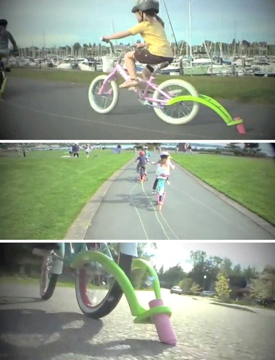 Coolthings ha realizzato ChalkTrail, un braccio di plastica con dei gessi colorati da fissare alla ruota posteriore della bici o al monopattino per disegnare sull’asfalto, come fosse una lavagna. Ogni singolo gesso può durare fino a due chilometri di strada. In vendita qui.