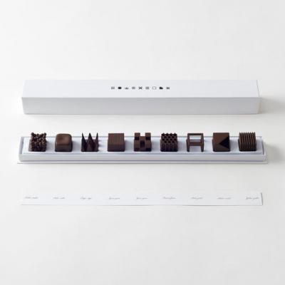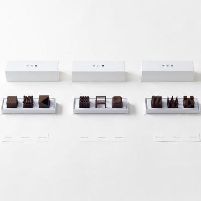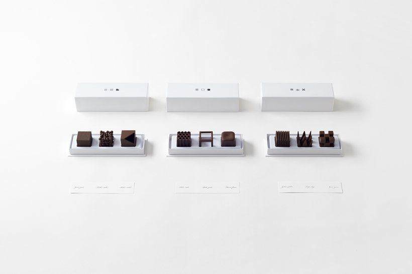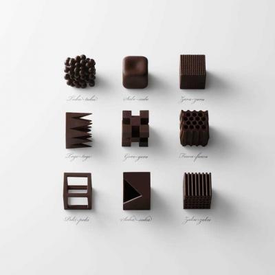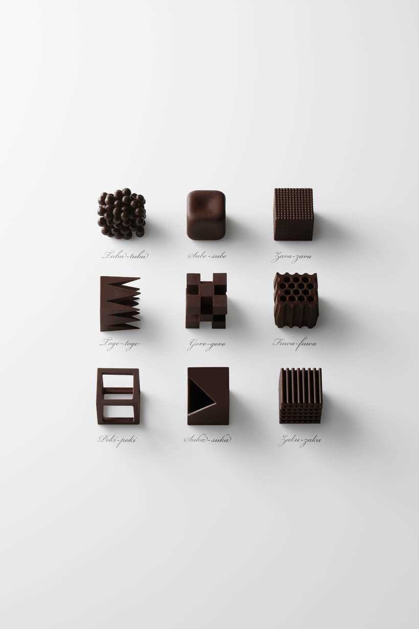 I 9 diversi tipi di cioccolato del progetto Chocolatexture presentano la stessa grandezza, 26x26x26mm. Le materie prime sono identiche, ma le trame e le forme distintive creano la diversità dei gusti. Ogni cioccolatino prende il nome dall’espressione giapponese utilizzata per descrivere il tipo di texture.