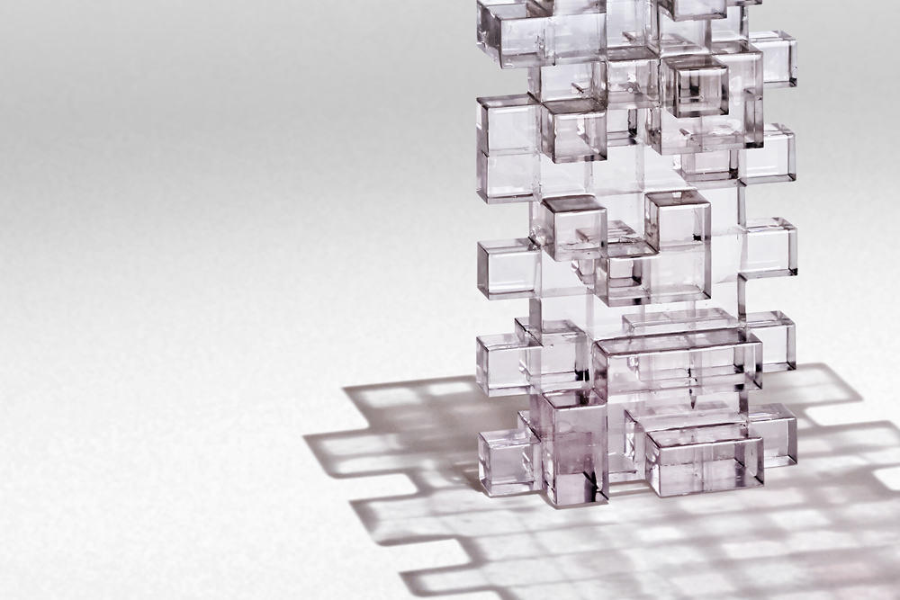 La materia plastica, permeabile alla luce, rafforza il concetto di transizione. La struttura è priva di montaggio, formata da tanti cubi assemblati a mano, piccoli frammenti che danno il senso della decostruzione e trasformazione dell’oggetto.