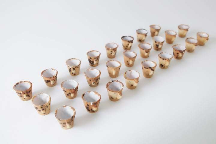 Funzionale e commestibile al tempo stesso, la tazzina da caffè è rivestita internamente con un particolare zucchero a velo, che funziona come isolante, rendendo la tazza impermeabile, e che dolcifica al tempo stesso.
