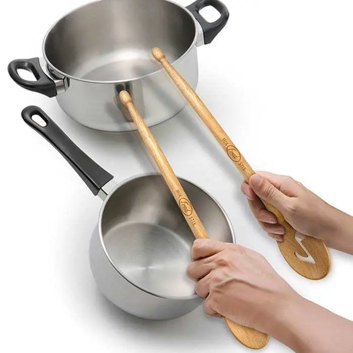 Nel verso classico servono da mestoli, ma, capovolti, si trasformano in bacchette. Così, in attesa dei tempi di cottura, si può rallegrare l’ambiente a ritmo di musica!
