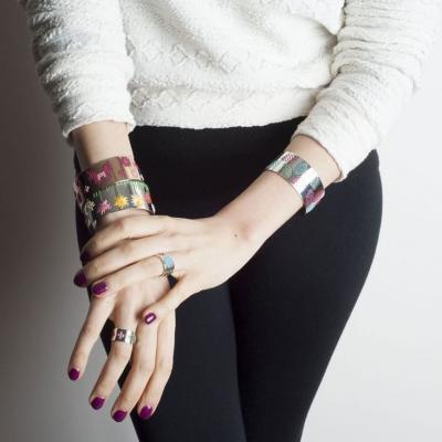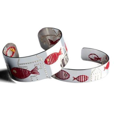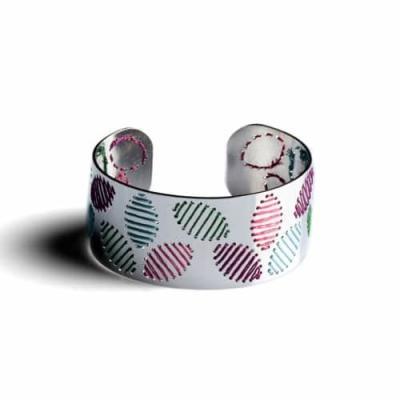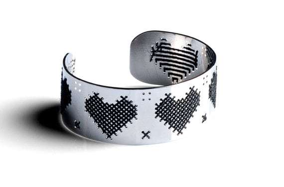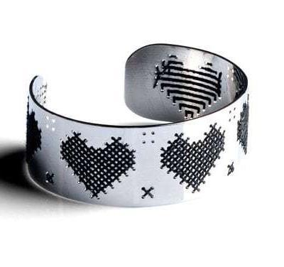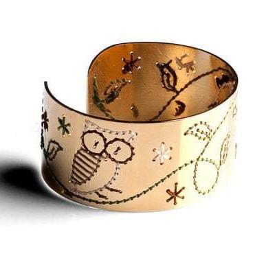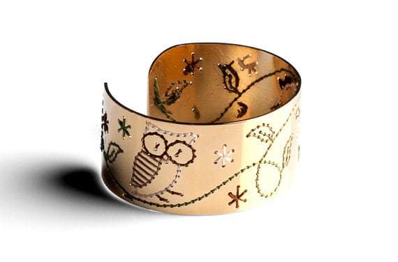 La monocromia del metallo è piacevolmente interrotta dai fili colorati, che ricamano con cura cuori, foglie, gufi ed altri incantevoli soggetti.