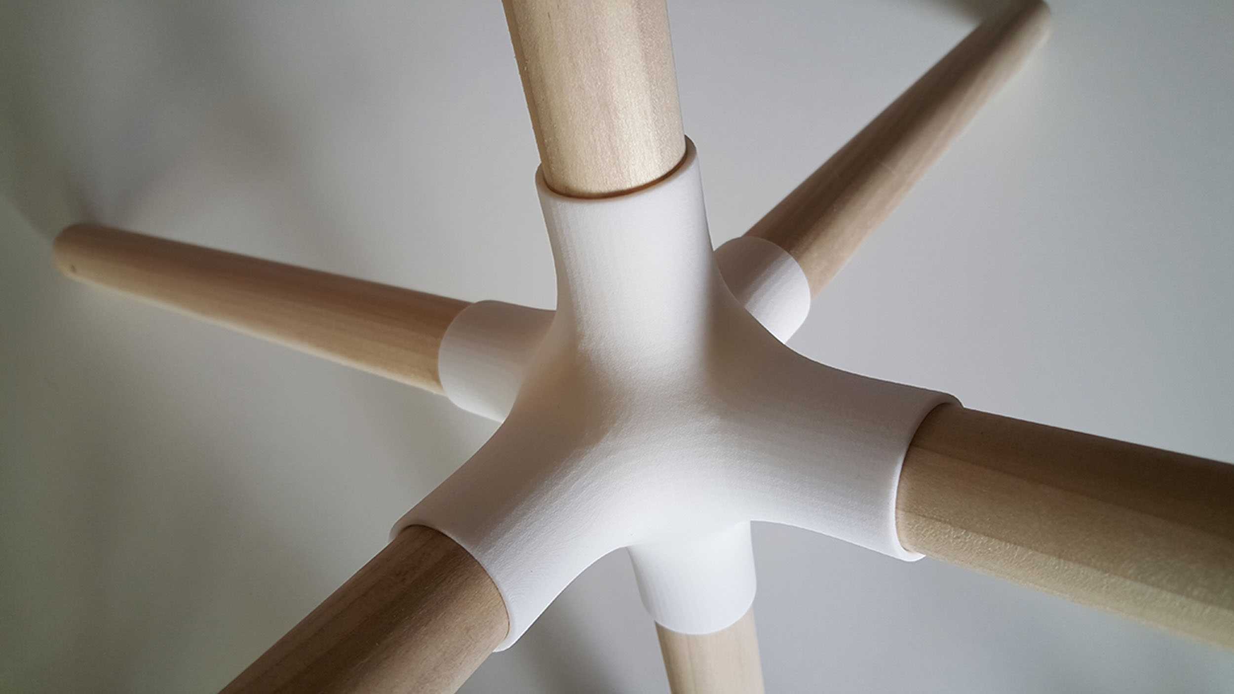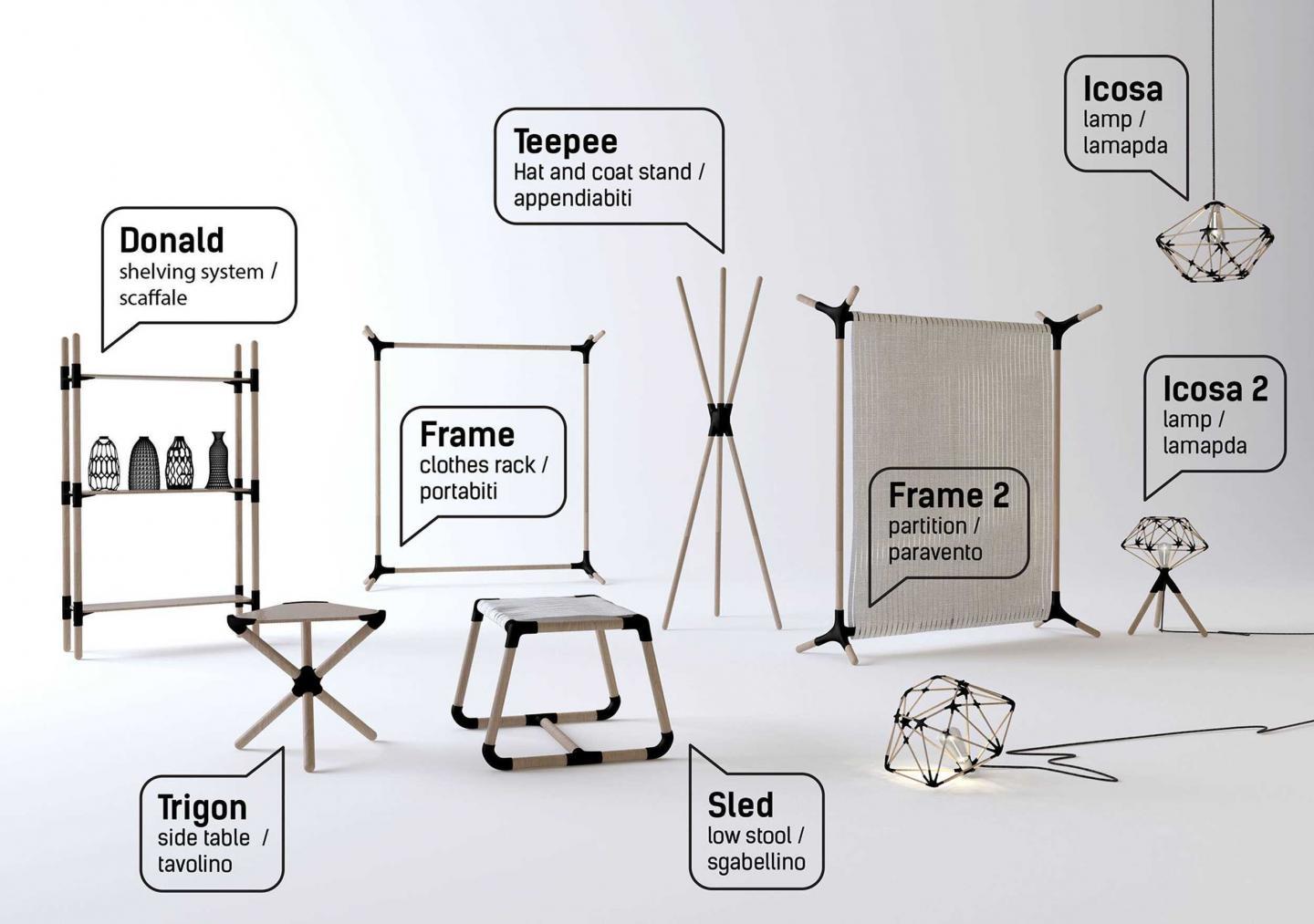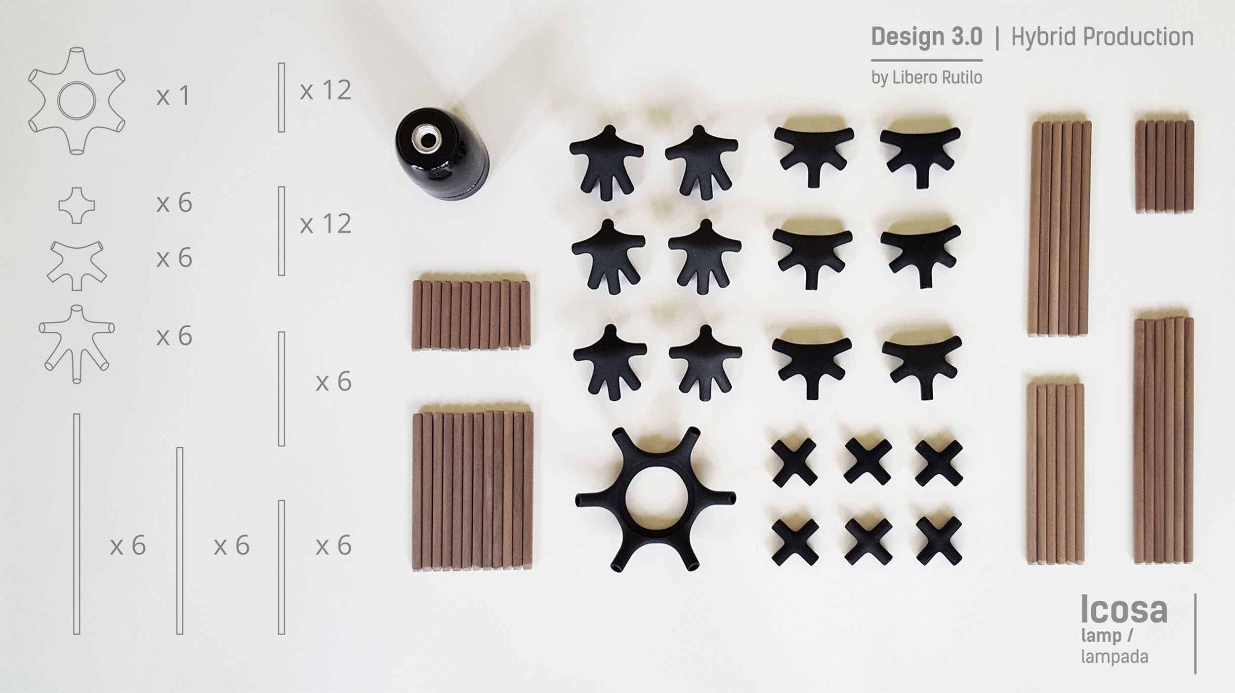 Il progetto in mostra è Design 3.0, a cura di Libero Rutilo, che esplora il tema delle nuove tecnologie di fabbricazione e il rapporto tra designer/artigianato e designer/industria. L’esposizione propone la sperimentazione di modalità di produzione ibride, nel quale il designer diventa progettista e produttore al tempo stesso, bypassando il sistema di creazione e distribuzione tradizionale. Il processo si traduce in una serie di oggetti autoprodotti che usano un sistema di giunti stampati in 3D ed elementi o materiali reperibili facilmente, dopodiché vengono assemblati con accessori di uso comune come manici di legno o bottiglie di plastica per creare una famiglia di prodotti di design.