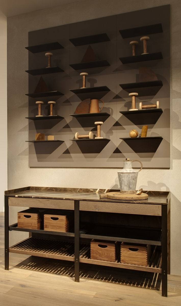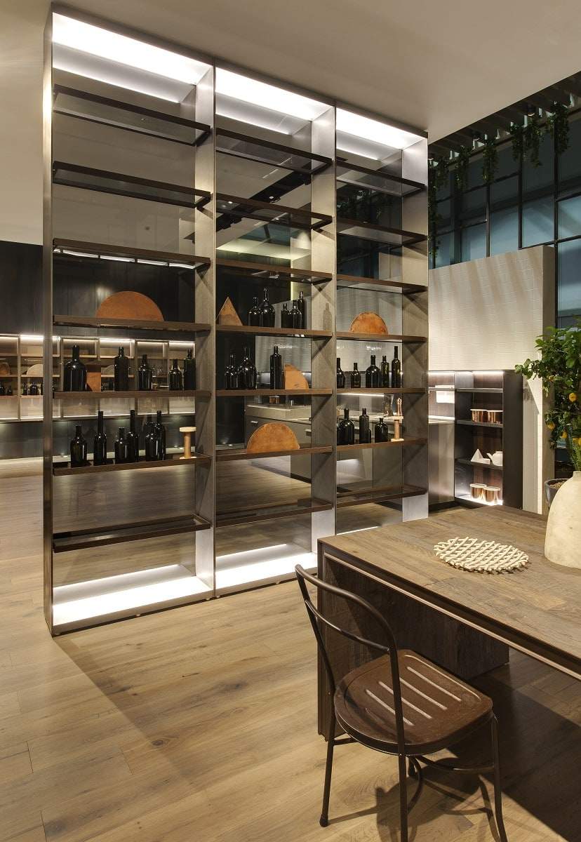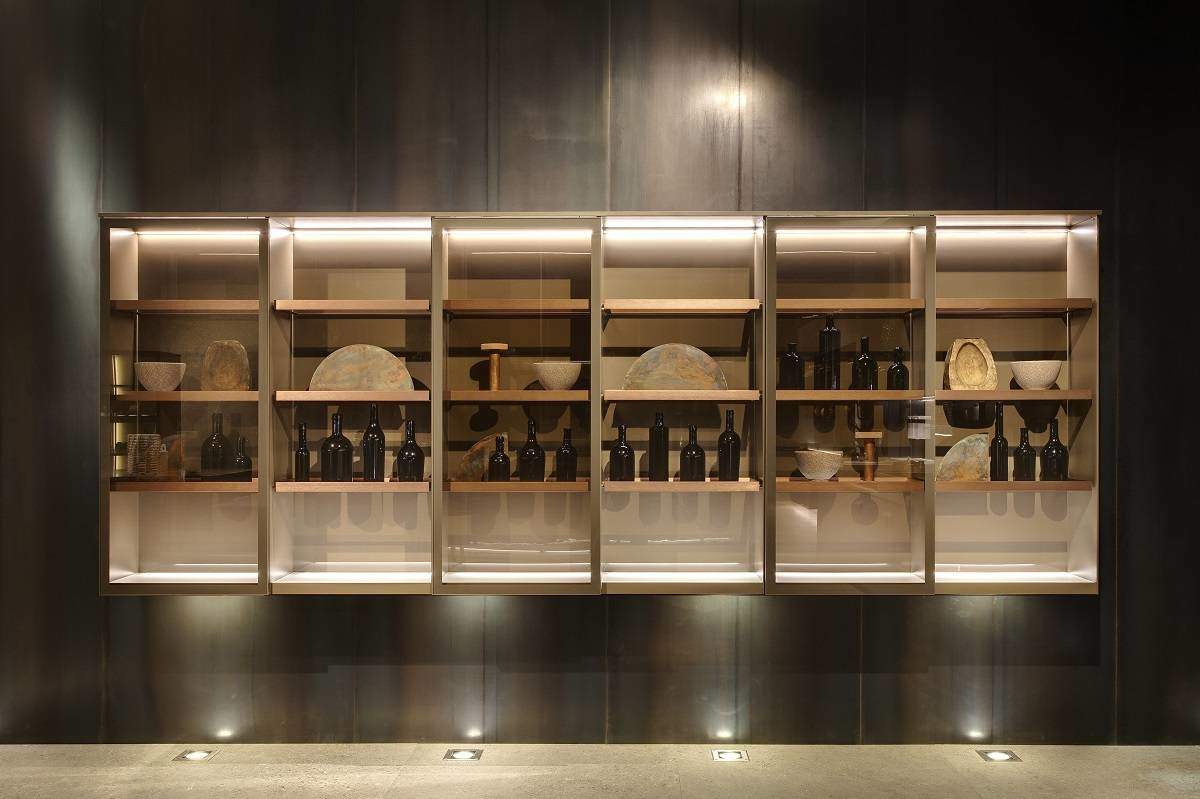 K-Lab è inoltre corredata di un porta-accessori, disponibile anche a corredo del sistema mensola – quest’ultimo è accessoriabile infatti con portabicchieri, portaspezie e portacoltelli. Completano il layout le vetrine Show, nelle versioni sospesa a parete e a terra.