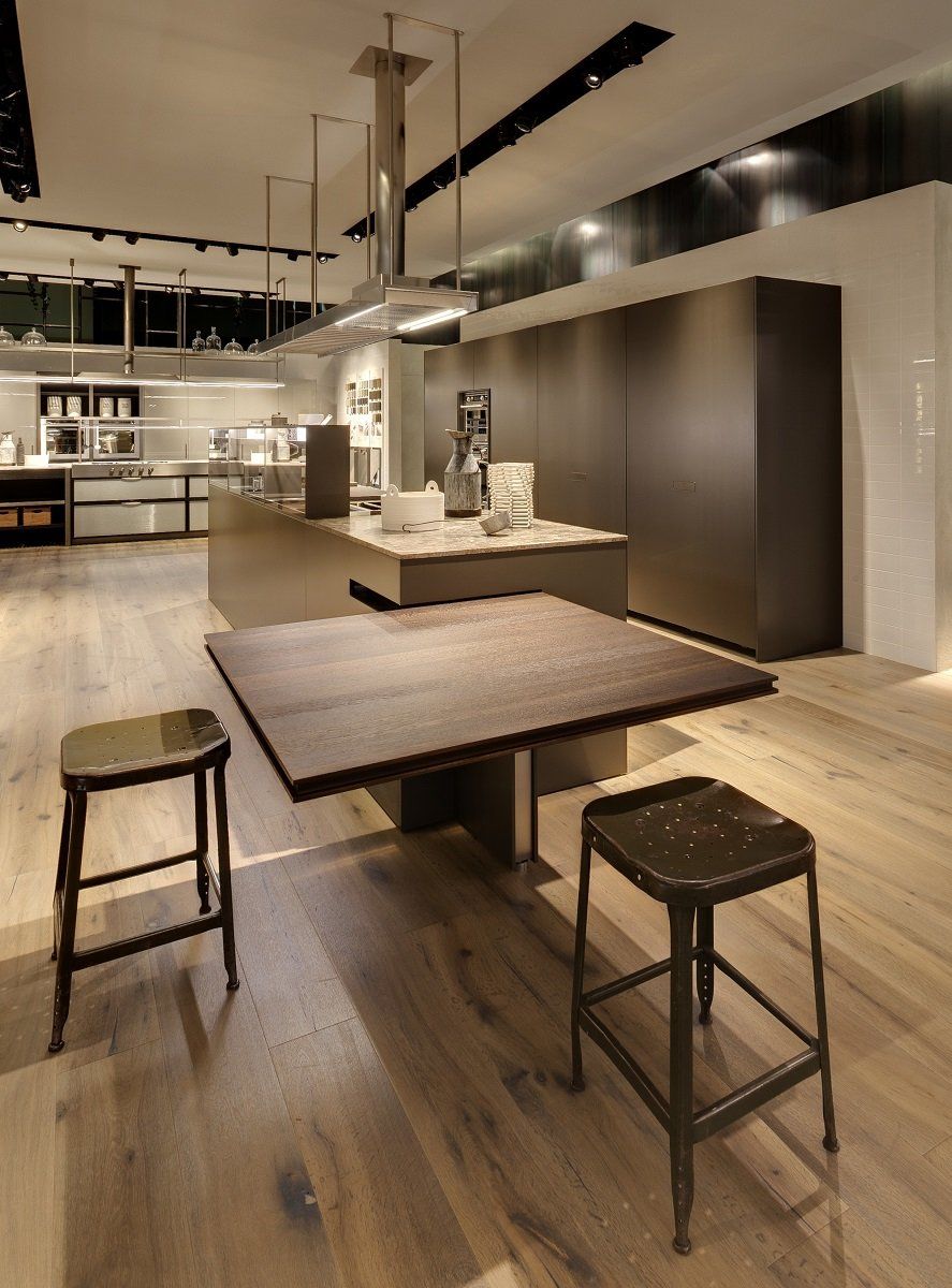 La struttura del nuovo tavolo K-TABLE utilizza gli stessi elementi con cui è sviluppato il K-System Base giorno, ed è personalizzabile nelle nuove finiture metallix o nei nuovi colori laccati effetto metallo. La versione esposta in fiera ha il piano in legno massello Deluxe rovere vintage, ma il tavolo è disponibile in tutti i materiali dei piani di lavoro Ernestomeda.