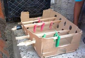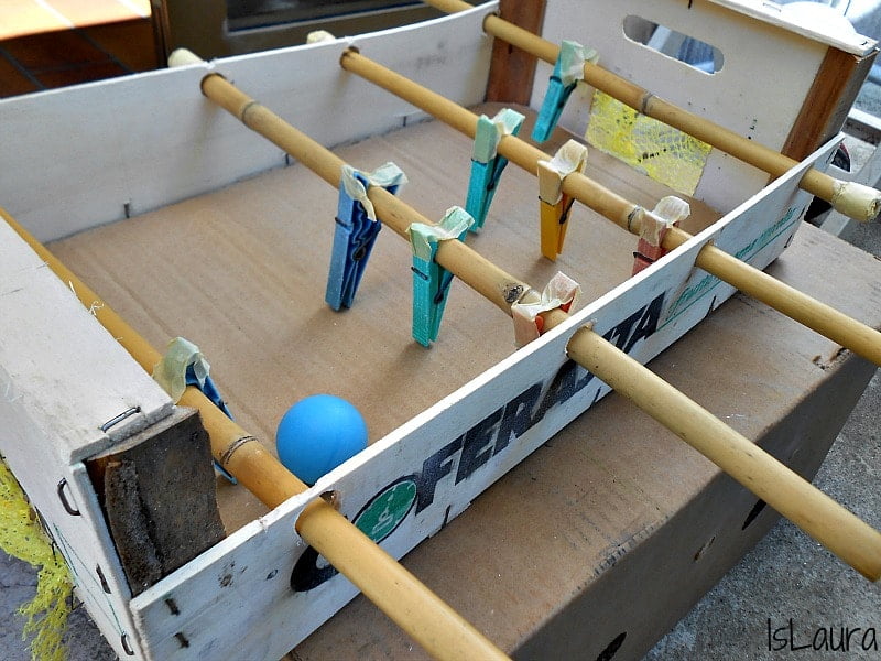 Sul sito islaura.it è possibile seguire anche un tutorial per realizzare un calcio balilla con una classica cassetta per la frutta e delle mollette per il bucato.