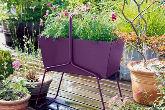 Leggere, ma robuste, le fioriere sono realizzate in alluminio, racchiuse in una struttura in filo di acciaio che costruisce in continuità gambe e manico.
