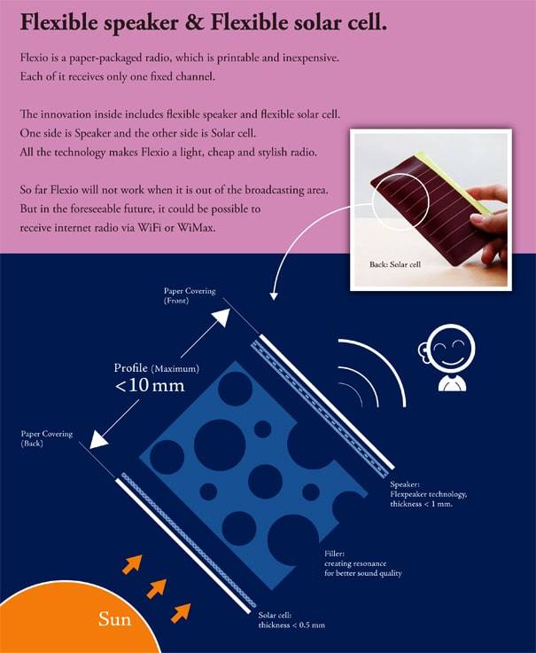 Flexio è la mini radio portatile ad energia solare, nata dall’intuizione creativa dei designer Wu Kun-chia, Wang Shih-ju, Chen Ming-daw e Liou Chang-ho. Interamente ricoperta di carta, Flexio risulta essere ecologica e divertente; le sue dimensioni ridotte consentono di portarla sempre con sé nella tasca di un cappotto o in un portafoglio. La mini radio si può ricaricare con la luce del sole ed il suo funzionamento è estremamente semplice; la stazione radio FM è infatti preselezionata in quanto non provvista di sintonizzatore.