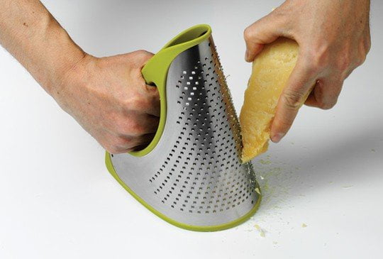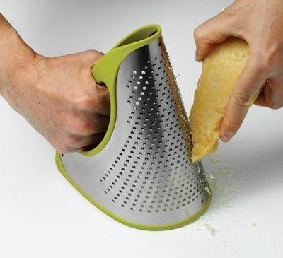 La riduzione dell’ingombro è uno dei vantaggi più evidenti, ma la moderna grattugia in acciaio nasconde altre interessanti proprietà, che si scoprono con l’utilizzo; prima tra tutte, quella di garantire una facile pulizia ordinaria: piegando l’acciaio, cambiano impercettibilmente anche la posizione e la forma dei fori, e questo movimento favorisce la rimozione di tutti i residui di formaggio, anche di quelli che di solito faticano a lasciare la superficie della grattugia.