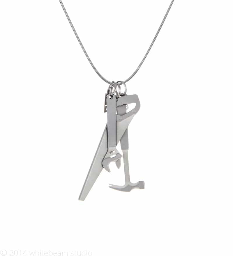 Forbici, pinze, martelli, squadre, livelle… tutti gli attrezzi sono meticolosamente riprodotti in miniatura, trasformati in gioielli per uomo e per donna.