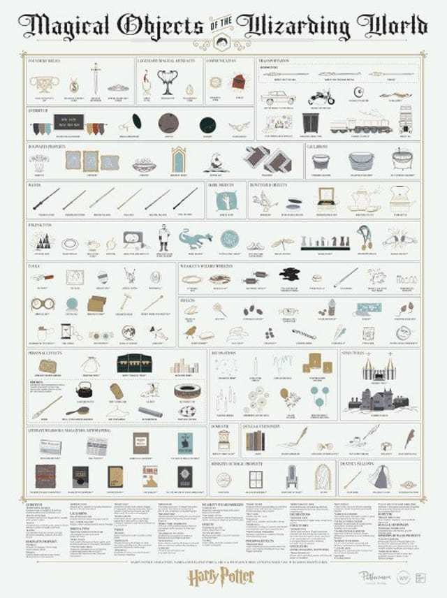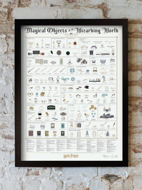 Pop Chart Lab, in collaborazione con Pottermore, ha dedicato un poster al mondo stregato di Harry Potter. Il poster comprende l’illustrazione grafica di tutti gli oggetti magici custoditi nella rinomata scuola di Hogwarts, con tanto di annotazioni utili. Una guida interessante per maghi e babbani, che potranno esercitare poteri e ripassare formule magiche in attesa dello scontro finale!
