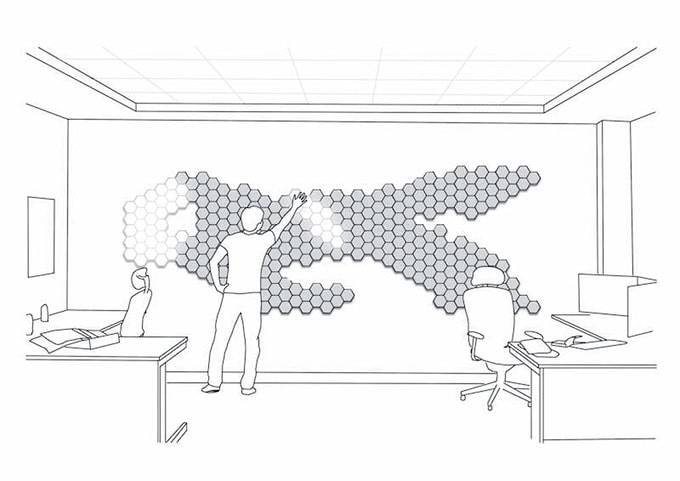 Il design è dinamico e coinvolgente: il muro è trasformato in tela e la mano in pennello. Al posto del colore c’è la luce, che si controlla con un semplice sfioramento.