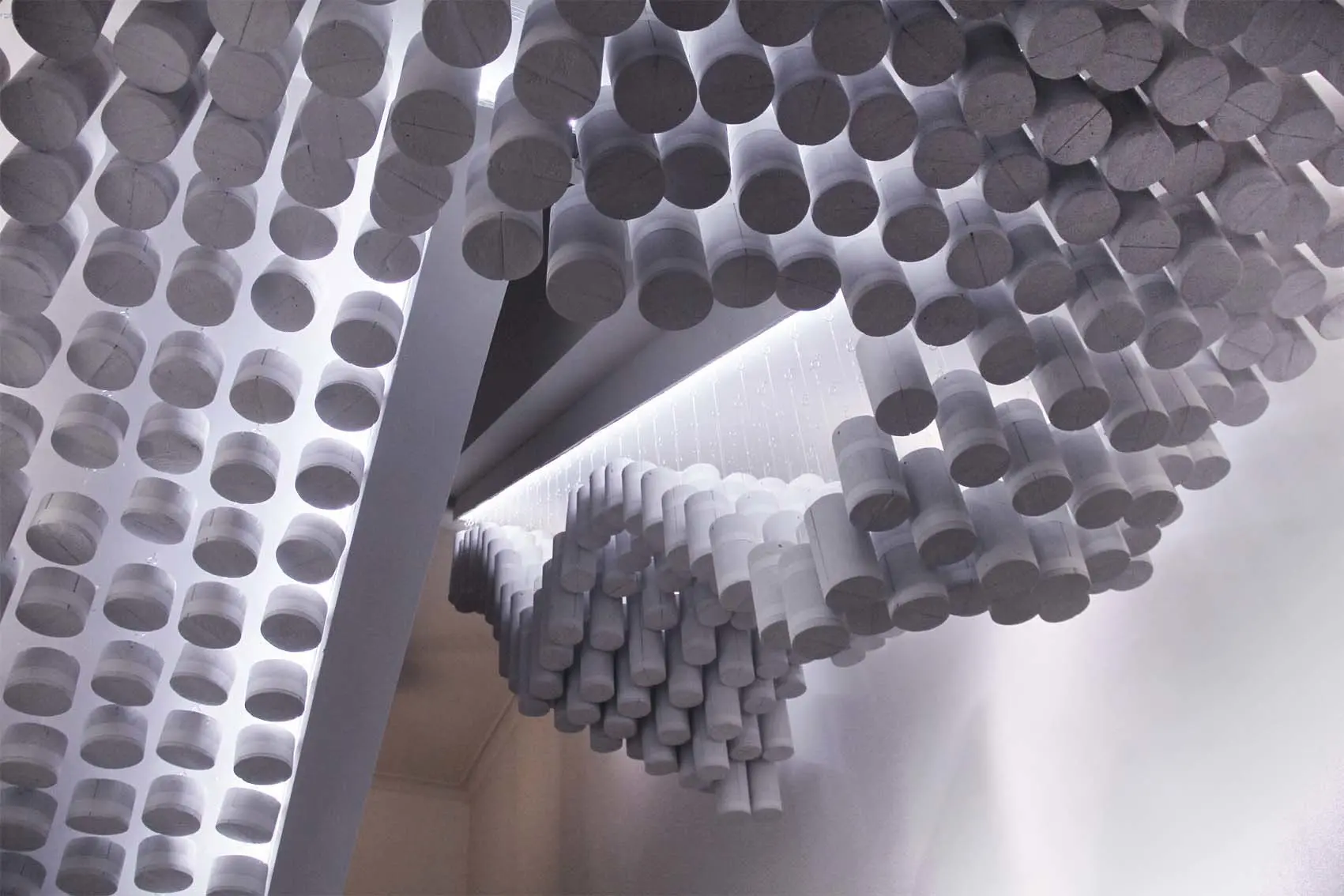 I componenti sono realizzati con materiale di riciclo, ricavati da tubi di schiuma poliuretanica destinati ai rifiuti e trasformati, attraverso taglio, assemblaggio e verniciatura nei moduli finali che compongono “La Nube”.