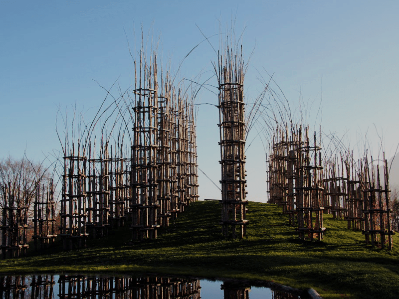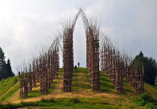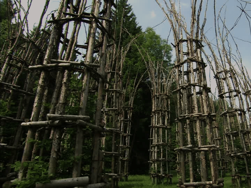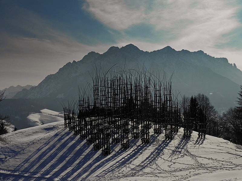 A dieci anni di distanza un’altra Cattedrale si innesta nell’idilliaco paesaggio delle Alpi Orobie. Costruita in materiale vegetale locale, la struttura è composta da cinque navate costellate da un centinaio di colonne di rami intrecciati, alte sino a quindici metri. All’interno di ognuna è piantato un faggio, che un giorno, quando non necessiterà più di un sostegno, prenderà il sopravvento sulla struttura stessa, destinata a perire.