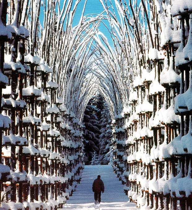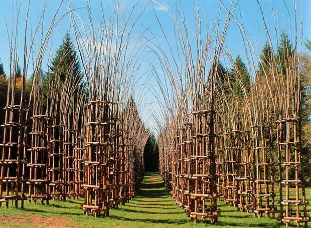 La scopo ultimo dell’imponente struttura, sviluppata su 1230 metri quadri, è custodire ed accompagnare la crescita di ottanta alberi. I rami di potatura diventano veri e propri pilastri che si sollevano fino a dodici metri e, disposti a coppie, disegnano delle arcate come volte di una navata gotica.