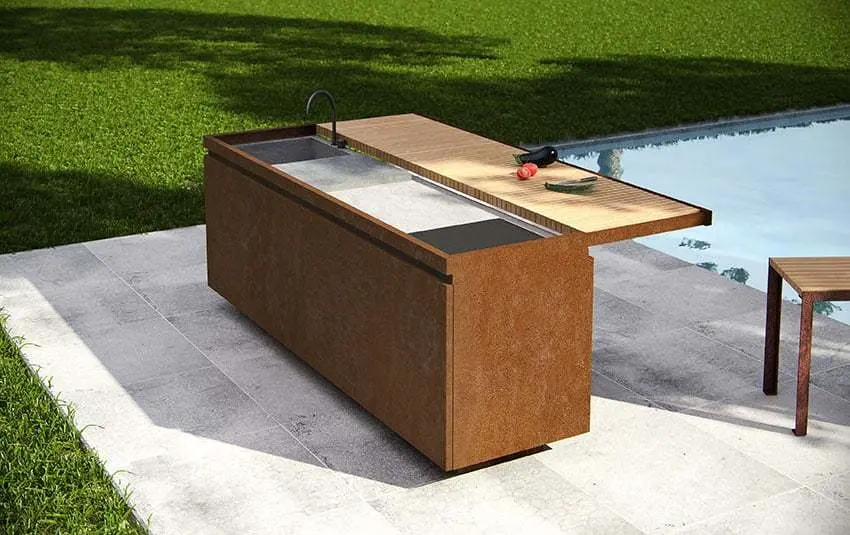 Stile e funzionalità si intrecciano nel disegno di Taglia & Cuoci, la cucina ad isola per esterni che Artena Design by Grassi Pietre ha concepito nei dettagli per adattarsi al meglio alle esigenze del cucinare e ricevere ospiti all’aperto all’insegna della convivialità.