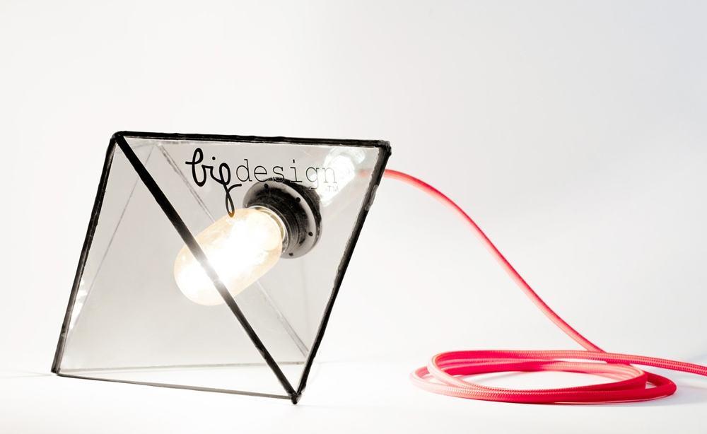 Il tetraedro, simbolo platonico del fuoco, formato da 4 triangoli equilateri, è riprodotto con 3 triangoli equilateri di vetro saldati con la tecnica Tiffany. La lampada da terra è dotata di lampadina ad incandescenza.