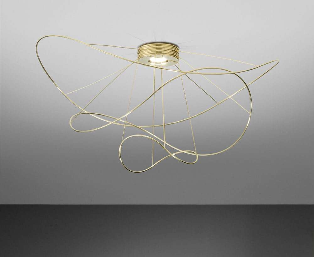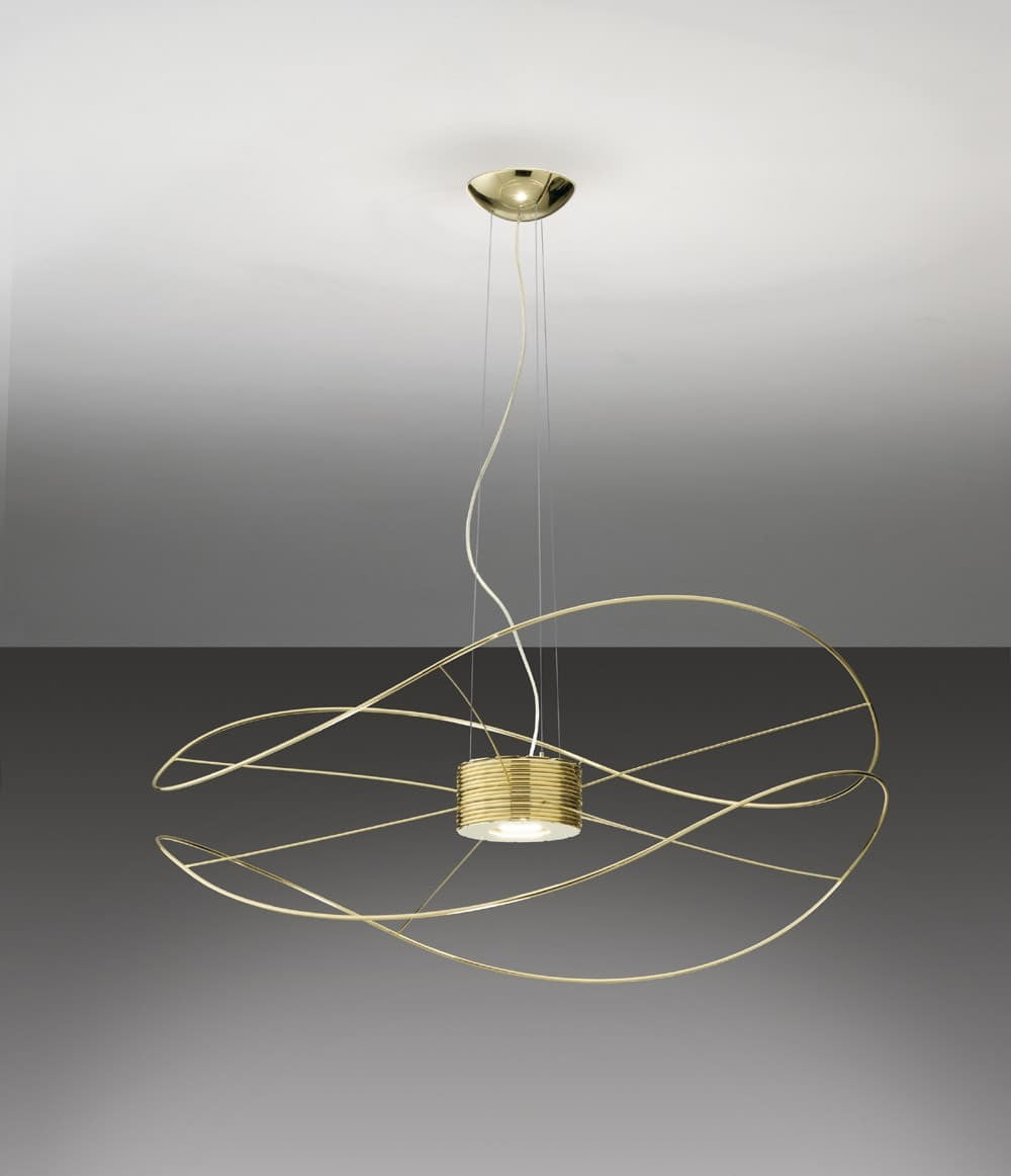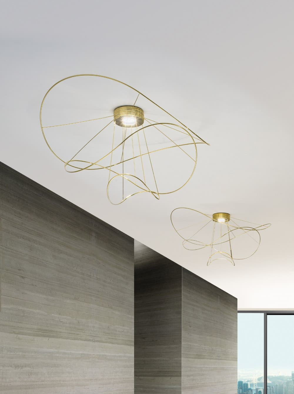 La luce calda dimmerabile, con up- e downlight nelle sospensioni, diventa il fulcro attorno al quale ruotano e si intrecciano curve dorate, protagoniste di una danza di luce attorno al sole.