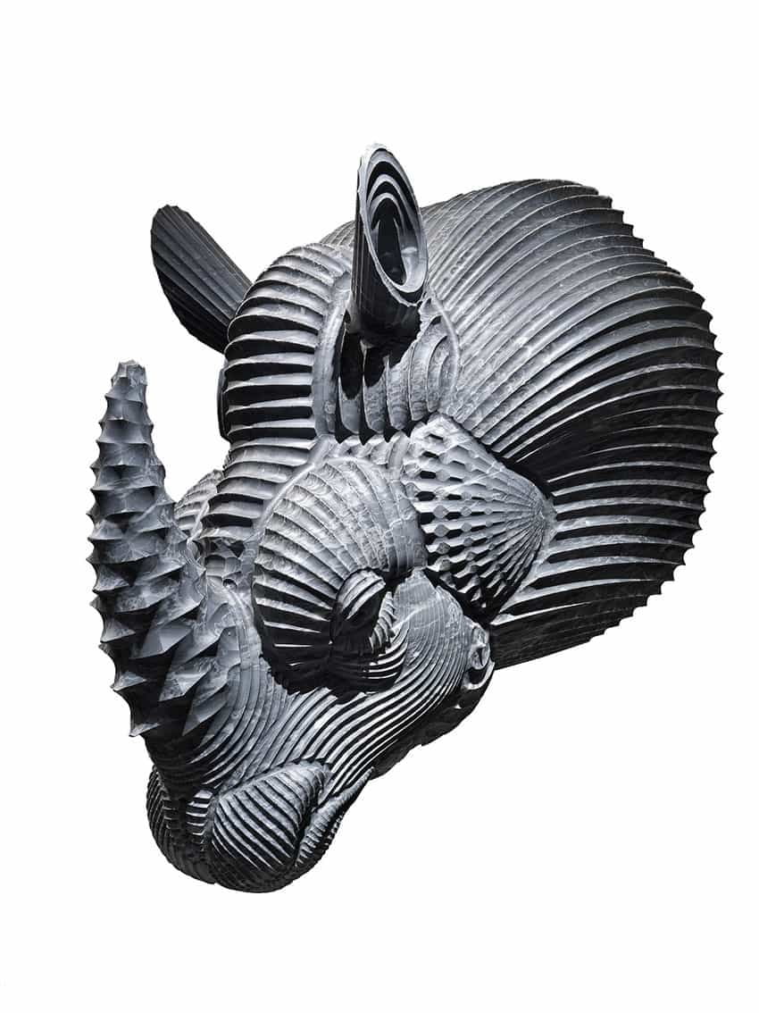 Ispirato ad una incisione di Albercht Durer del 1515. Come i tratteggi manuali rettilinei, curvi o geometrici delineano la figura bidimensionale, così la fresa scolpisce la massa e disegna la superficie tridimensionale.