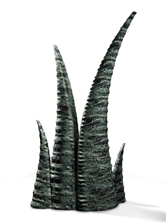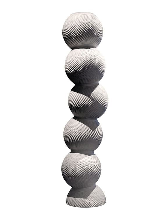 Sfida al risparmio della materia. Grazie ad un complesso progetto realizzato con software parametrico e l’impiego della tecnologia di taglio Waterjet a 5 assi, a partire da una sovrapposizione di dieci lastre in marmo per un totale di 30 cm di spessore, si è riusciti a sviluppare una figura multi-punte, divaricata, sinuosa, tortile e cava di ben 3m di altezza, formata da 100 anelli monolitici sovrapposti senza produrre scarto. Tutta l’opera risulta svuotata al suo interno e le pareti arrivano ad uno spessore di soli 3 cm.